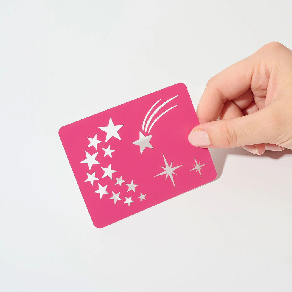 Que ce soit pour un festival, une fête, un mariage ou simplement pour se faire plaisir, nos pochoirs sont l’accessoire parfait pour des looks éphémères et pétillants. Ils s’utilisent avec notre Gel Pailleté prêt à l’emploi ou, pour une version personnalisée, avec le Baume Onctueux et des paillettes libres. Quelle que soit la méthode choisie, le résultat est toujours bluffant !